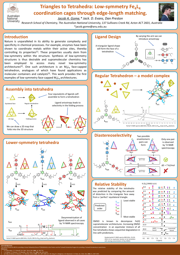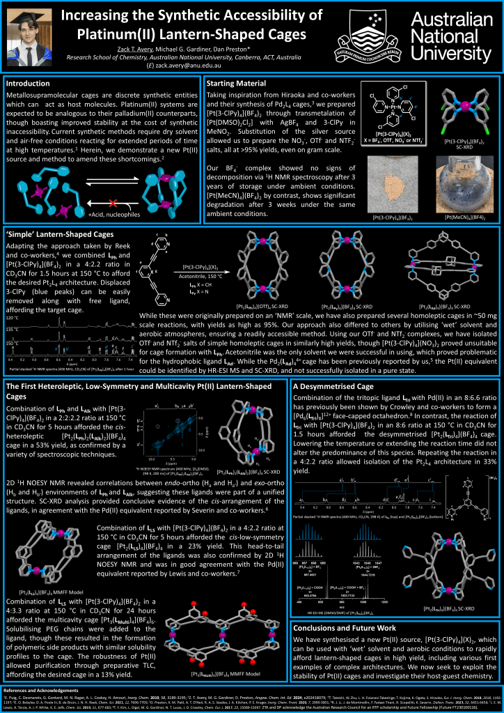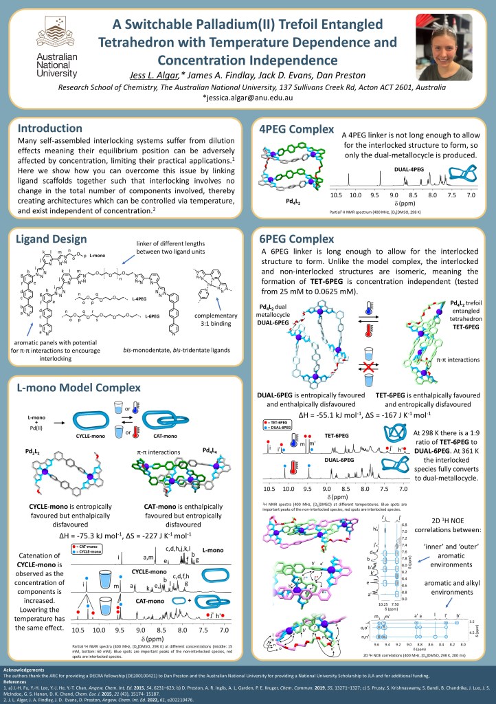 Group posters Jess Algar’s award winning poster from RACI Congress, 2022, Brisbane, Australia. Jess Algar’s poster from Supramol24 on metallo-interlocked architectures. Jacob Gome won a poster prize at Supramol25 with this effort. Zack Avery’s poster to be presented at the upcoming ISMSC2025 conference Share this: Click to share on X (Opens in new window) X Click to share on Facebook (Opens in new window) Facebook Like Loading...